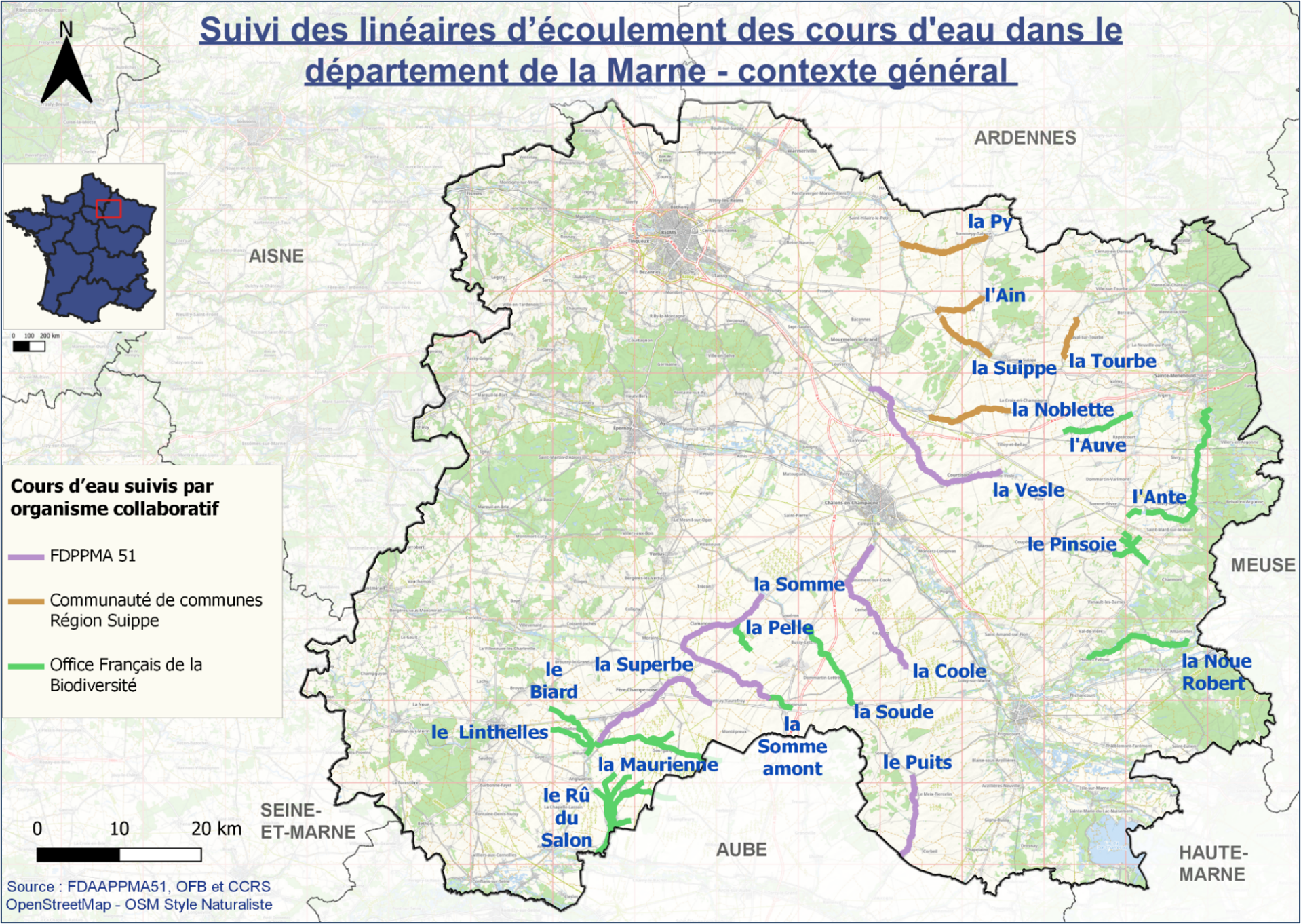 Suivi des linéaires d'écoulement des cours d'eau de la Marne